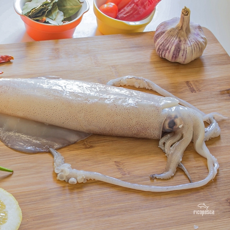 Calamar de tamaño mediano, presentado envuelto individualmente, cada pieza tiene un peso aproximado de 400 a 600 gramos. Su precio de venta es por kilogramo